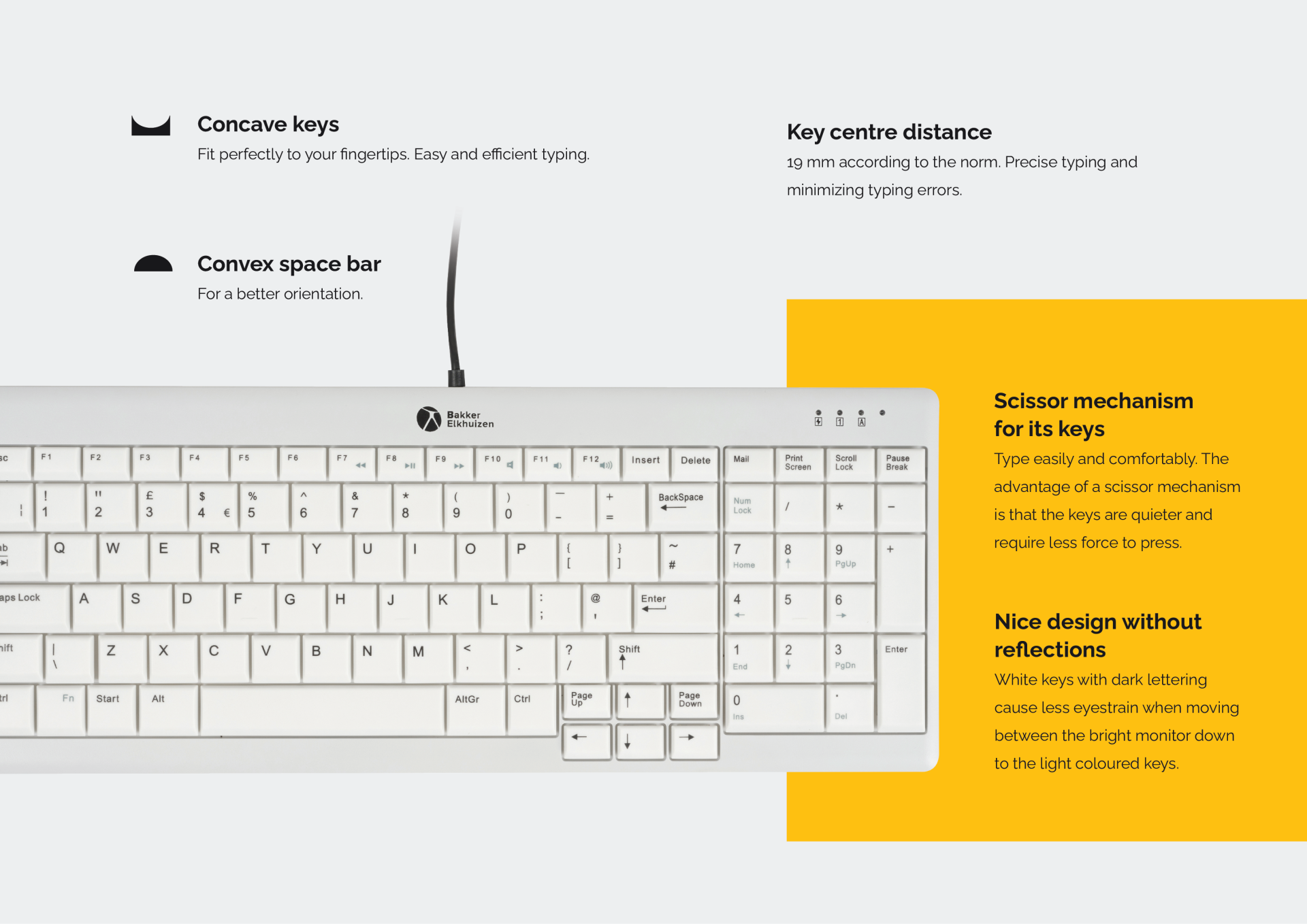 Het UltraBoard 960 V2 heeft een toets afstand van 19 mm in overeenstemming met de DIN EN ISO-normen. De concave (hol) vorm van de toetsen komt overeen met de contouren van de vingertoppen‘, terwijl de convexe (bol) spatiebalk helpt bij de oriëntatie. Deze ontwerpelementen helpen typfouten te verminderen en zorgen voor efficiënt en precies typen.